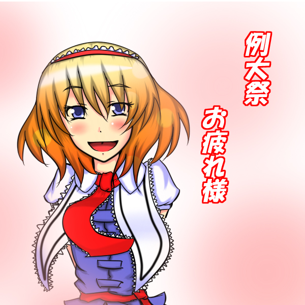 いやー今回のイベントはゲーム大会がすごく面白かったですww 花英塚大会の決勝とか人間の域を超えてたようなwww それにイベントそのものはすごくまったりしててよかったですー。 例大祭とか紅楼夢とかって周りの皆いそがしそうな感じですけど今回はまったりしまくってた感じでした。 ってことで次のイベントですが、次は崇敬祭に出る予定です。まだ申し込んでないですが キャラは神奈子で即決・・・なぜなら崇め敬う祭りだからwwww |